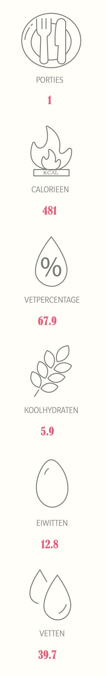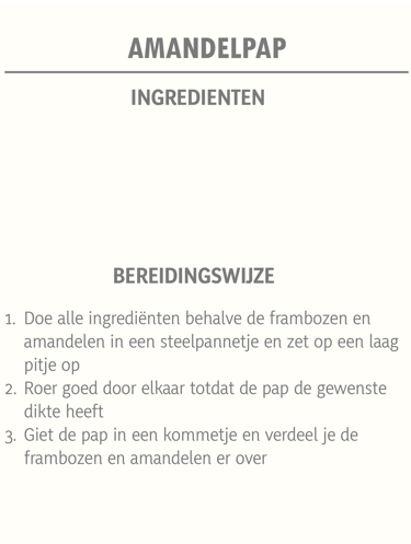 20 gram amandelmeel15 gr gebroken lijnzaad10 gr chiazaad10 gr kokosrasp0.25 tl amandelaroma
